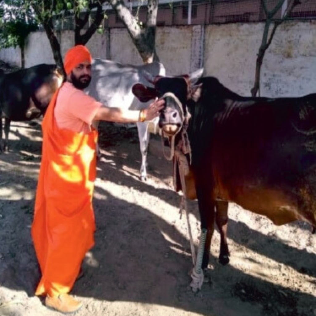स्वामी नागेन्द्र महाराज जी गाय माता की सेवा करते हुए ।